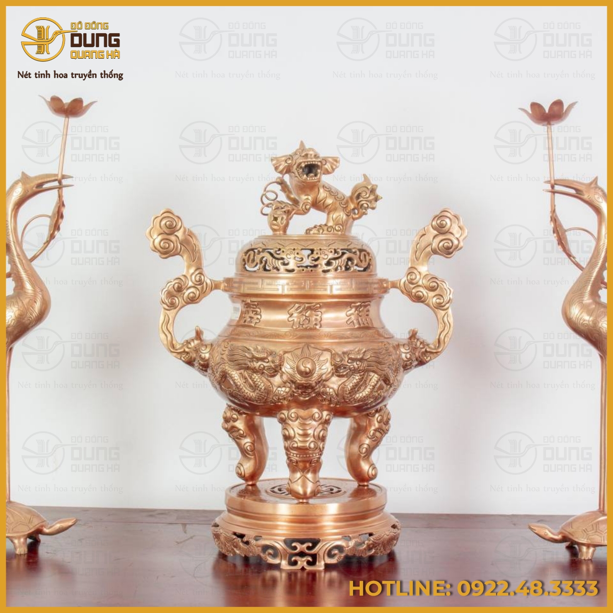 Bộ tam sự hạc đỉnh chạm song long chầu nguyệt bằng đồng đỏ là đồ thờ trang nghiêm tinh xảo, giàu ý nghĩa truyền thống sâu sắc – Tác phẩm có tại đồ đồng Dung Quang Hà. Hãy đến ngay với chúng tôi để có thể sở hữu những tác phẩm đẹp với nhiều ưu đãi hấp dẫn!