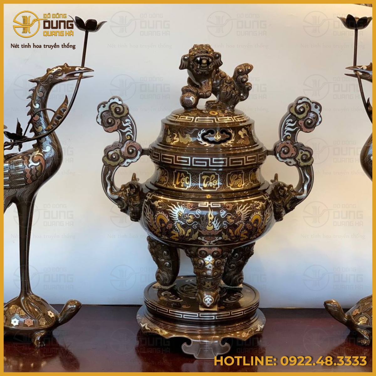 Bộ sản phẩm toát lên vẻ trang nghiêm với sắc đồng đỏ trầm ấm, mang đậm nét cổ kính. Các chi tiết khảm ngũ sắc rực rỡ tạo nên sự tương phản nổi bật trên đỉnh đồng và cặp hạc. Hình ảnh rồng mây và hoa văn trên thân đỉnh ánh lên vẻ lấp lánh tinh xảo. Đôi hạc được nghệ nhân chạm khảm tỉ mỉ, khiến từng đường nét lông vũ và hoa sen như sống động và tỏa sáng.