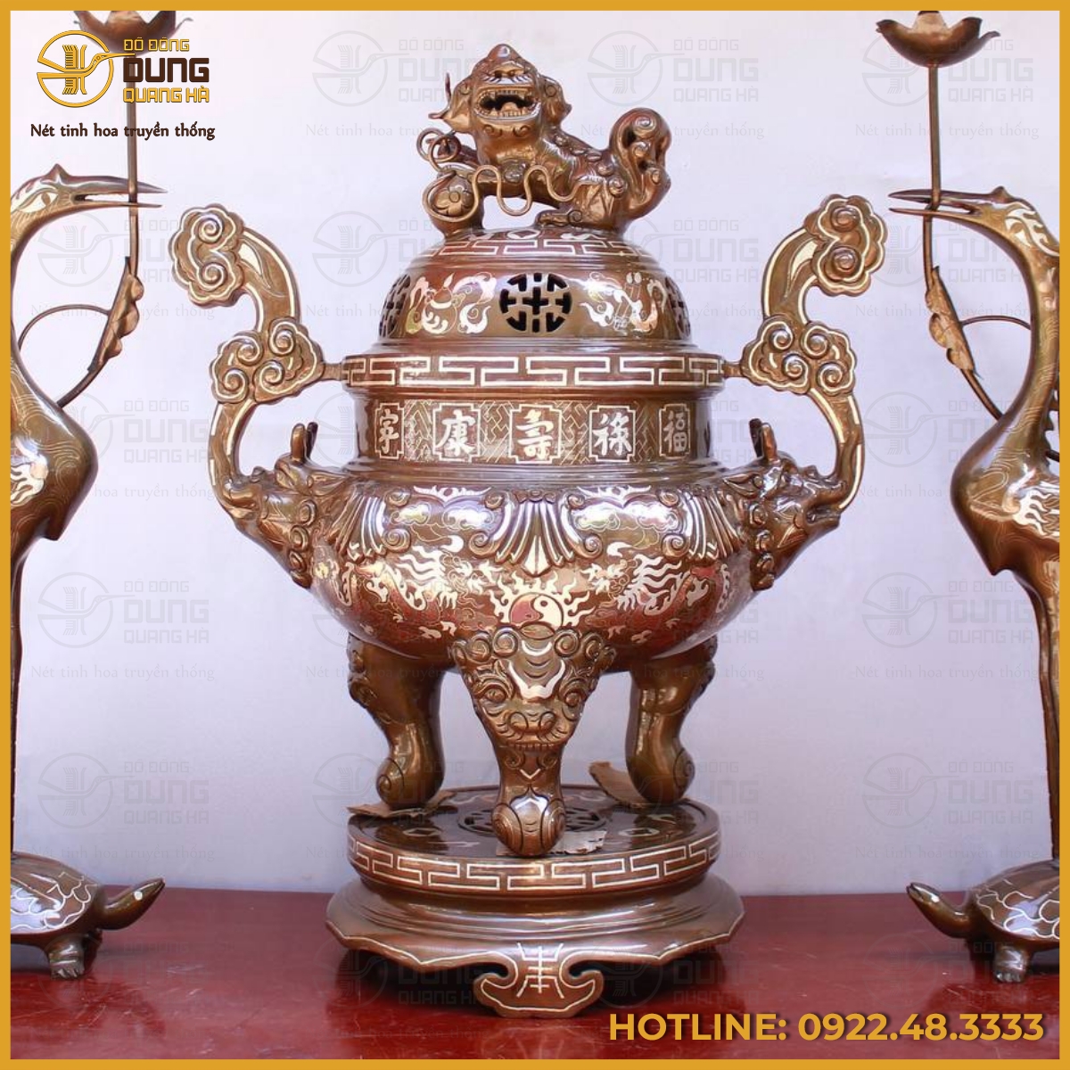 Bộ tam sự hạc chạm song long bằng đồng đỏ khảm tam khí là đồ thờ trang nghiêm tinh xảo, giàu ý nghĩa truyền thống sâu sắc – Tác phẩm có tại đồ đồng Dung Quang Hà. Hãy đến ngay với chúng tôi để có thể sở hữu những tác phẩm đẹp với nhiều ưu đãi hấp dẫn!