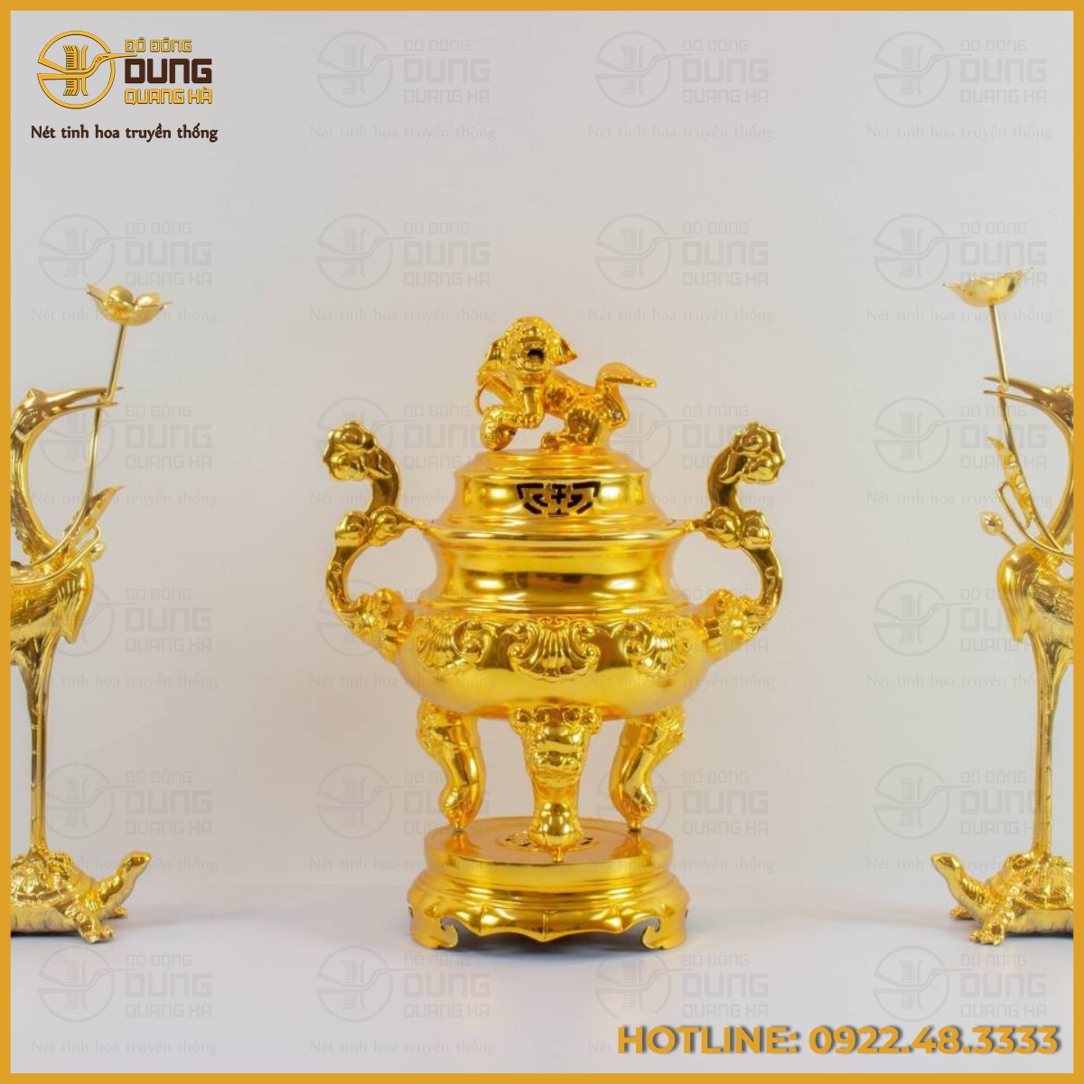 Bộ tam sự hạc đỉnh này tỏa ra một hào quang vàng ròng lộng lẫy, minh chứng cho chất liệu vàng 9999 tinh khiết. Kỹ thuật dát vàng thủ công đã tạo nên một bề mặt óng ánh, phản chiếu rực rỡ mọi nguồn sáng. Màu kim sắc đậm đà này không chỉ làm nổi bật sự tinh xảo của các hoa vănmà còn hàm chứa một cảm giác uy quyền và thịnh vượng tuyệt đối. Sự lấp lánh hoàng kim này biến bộ tam sự thành một kiệt tác tâm linh, là điểm nhấn cao quý và trang trọng nhất trên bàn thờ, thể hiện lòng thành kính và vị thế tôn nghiêm của gia chủ.