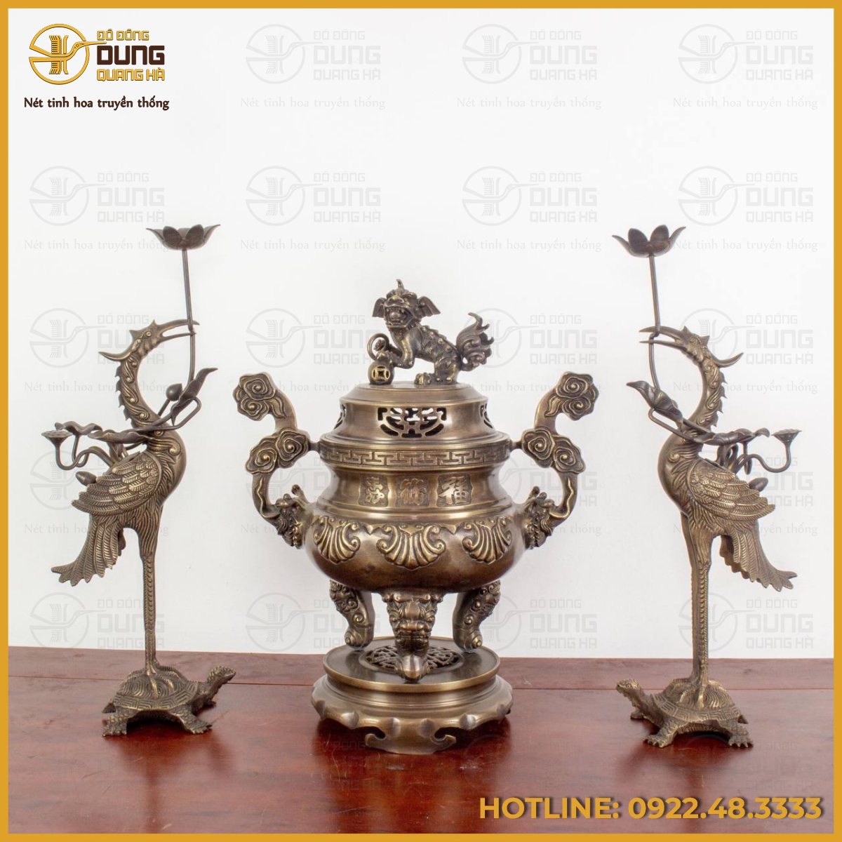Bộ tam sự hạc đỉnh toát lên một vẻ đẹp cổ kính và uy nghiêm, được bao phủ bởi sắc thái nâu trầm, ấm áp. Thay vì bóng loáng, bề mặt sản phẩm được nghệ nhân xử lý giả cổ tinh xảo, làm nổi bật từng đường nét chạm khắc rồng phượng, hoa văn đầy sống động. Gam màu này không chỉ gợi lên chiều sâu mà còn mang lại cảm giác thâm nghiêm, trang trọng, rất phù hợp cho không gian thờ tự. Sự hài hòa, không phô trương của màu sắc tổng thể giúp tôn lên sự linh thiêng, giữ cho nơi thờ cúng luôn giữ được sự tôn kính, ấm cúng mà không hề chói lòa.