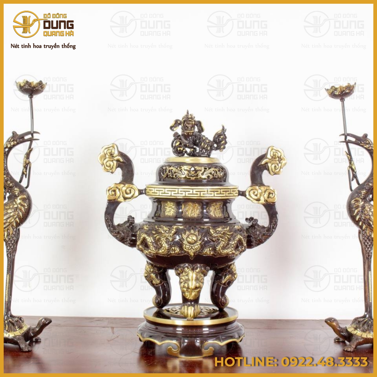 Tâm điểm của bộ sản phẩm là chiếc lư hương vững chãi, mang hình dáng trụ tròn, được nâng đỡ trên ba chân quỳ chắc khỏe. Bề mặt thân lư nổi bật với họa tiết song long chầu nguyệt được chạm khắc tinh xảo, thể hiện sự uy quyền và linh thiêng. Đôi rồng uốn lượn mềm mại nhưng vẫn toát lên vẻ hùng dũng. Hai quai lư được uốn cong theo hình mây bồng bềnh, tạo nên sự thanh thoát, đối lập hài hòa với sự mạnh mẽ của rồng. Phía trên nắp lư là hình tượng Nghê tọa với thần thái oai vệ, đầu hướng thẳng như đang canh giữ không gian thờ cúng.