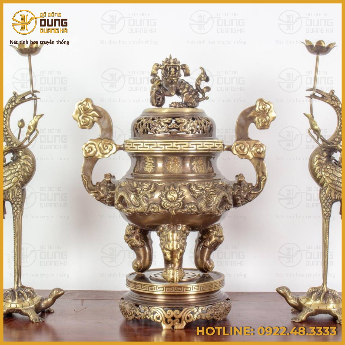 Bộ tam sự hạc đỉnh chạm song long đồng vàng hai công nghệ là đồ thờ trang nghiêm tinh xảo, giàu ý nghĩa truyền thống sâu sắc – Tác phẩm có tại đồ đồng Dung Quang Hà. Hãy đến ngay với chúng tôi để có thể sở hữu những tác phẩm đẹp với nhiều ưu đãi hấp dẫn!