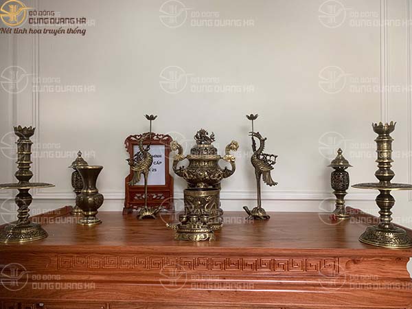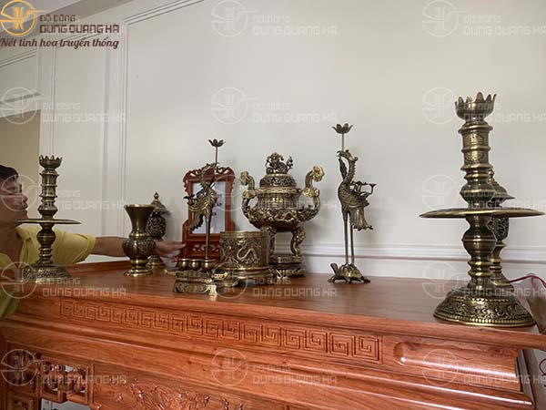 Bộ đồ thờ này từ chúng tôi được khách hàng lựa chọn là bộ đồ thờ hun giả cổ và được nghệ nhân cạo màu tại những chi tiết để làm nổi những họa tiết hoa văn. Bộ đồ thờ này có những món bao gồm như bộ ngũ sự, bát hương, đèn thờ, lọ hoa và bộ ba chén được đặt trước bát hương. Với họa tiết song long chầu nguyệt thì còn sở hữu ý nghĩa phong thủy cao đưa cho gia chủ xua đuổi được những khí xấu và bày tỏ được tấm lòng từ con cháu đối với ông cha.