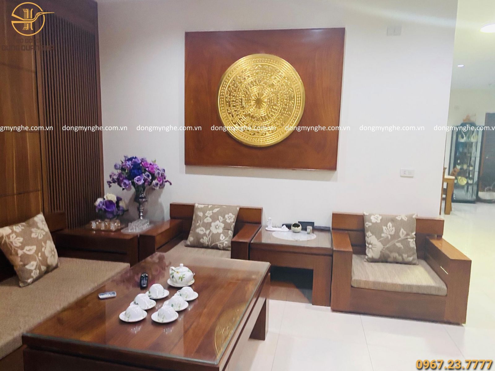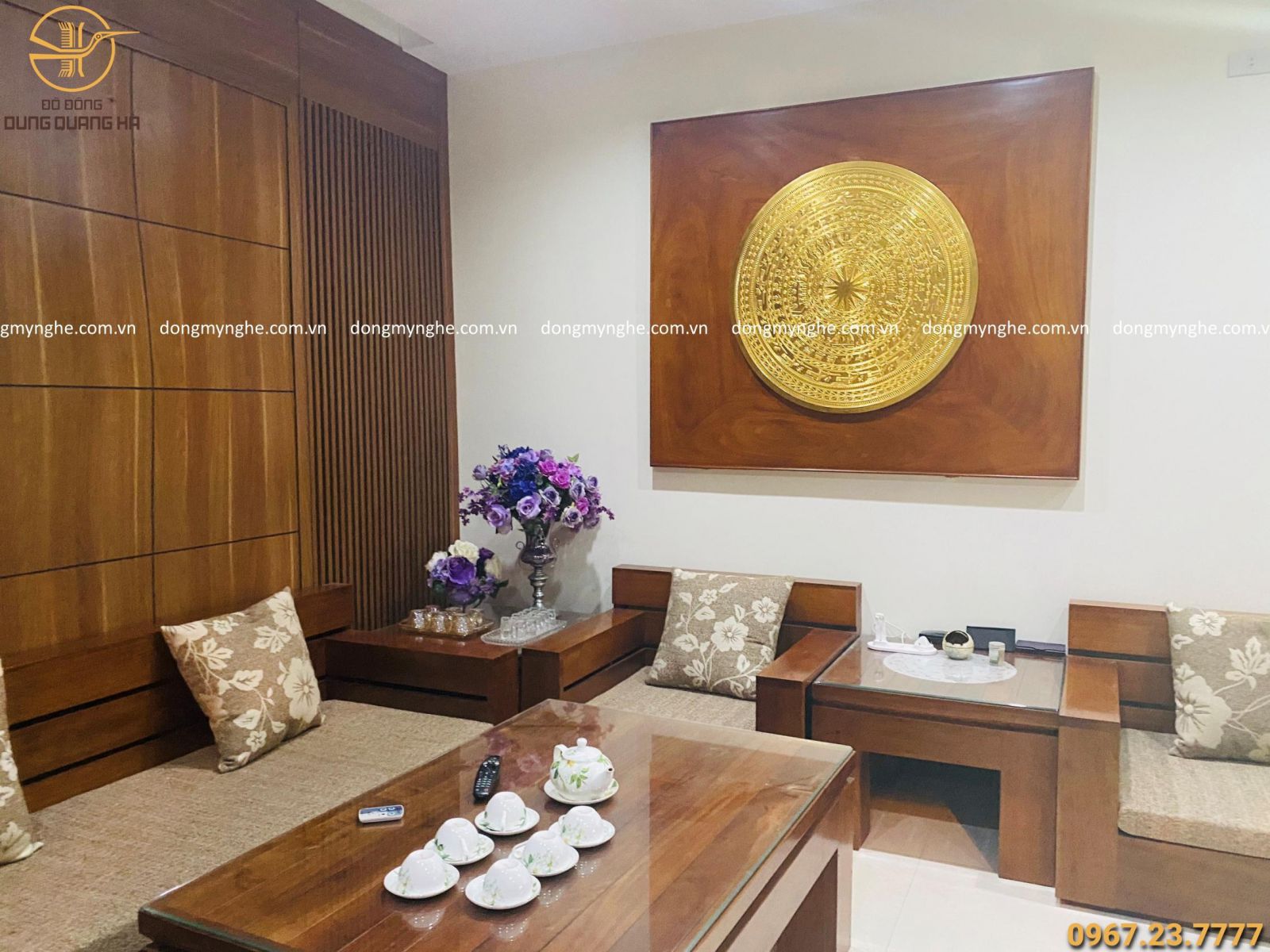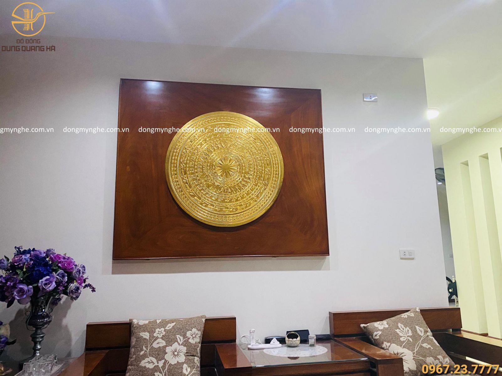 Cơ sở Đồ Đồng Dung Quang Hà lắp đặt mặt trống đồng dát vàng đường kính 90cm cho khách tại Nghệ An.