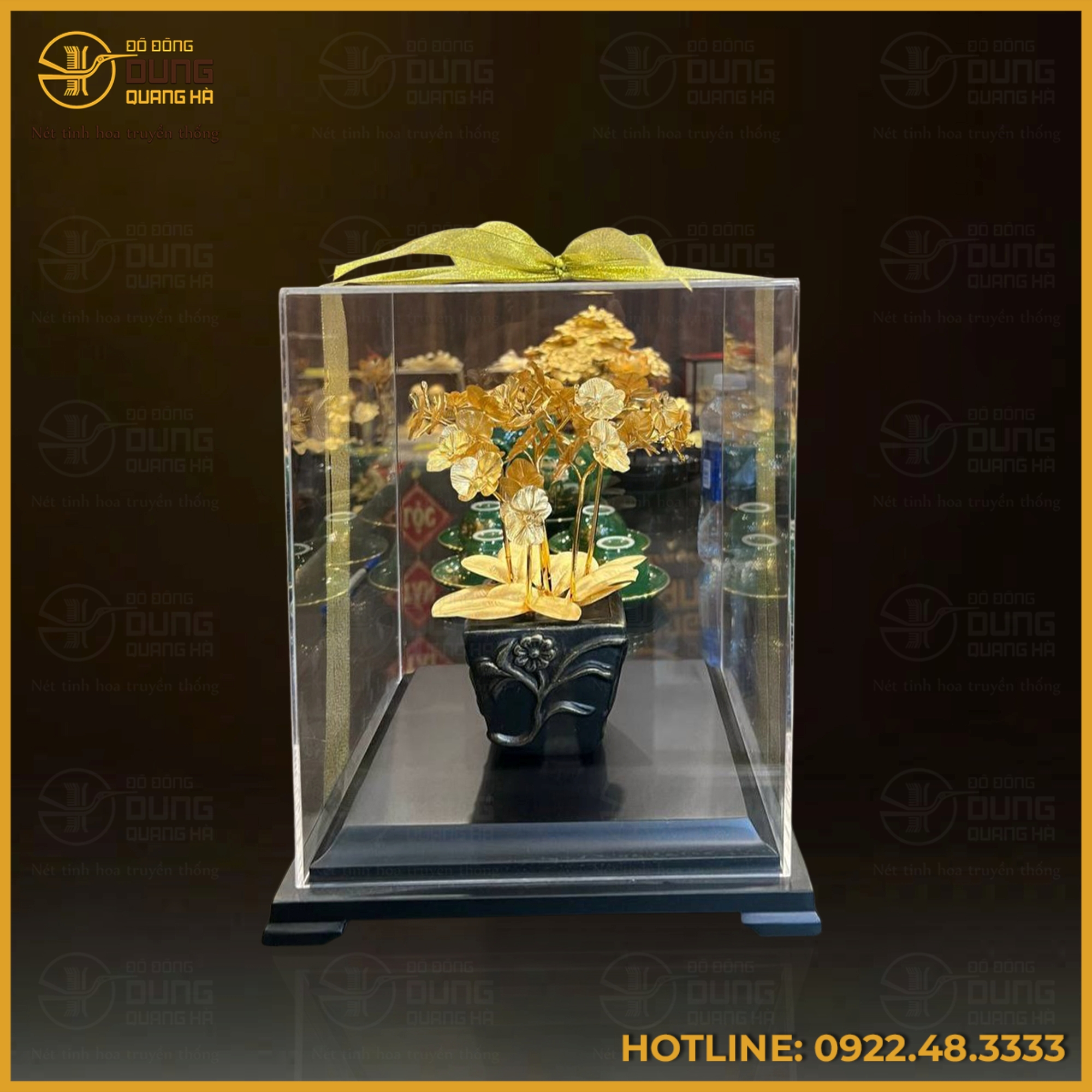 Bên cạnh đó, hoa lan từ lâu đã được xem là biểu tượng của vẻ đẹp thanh cao, sang trọng và quý phái. Sự kết hợp giữa vẻ đẹp vĩnh cửu của hoa lan và lớp mạ vàng lấp lánh đã tạo nên một vật phẩm mang giá trị lớn, thể hiện sự trân trọng và thành kính của người tặng dành cho người nhận. Đây là món quà hoàn hảo để bày tỏ lòng biết ơn, sự ngưỡng mộ và tình cảm chân thành trong những dịp quan trọng như lễ tết, khai trương, hay kỷ niệm.